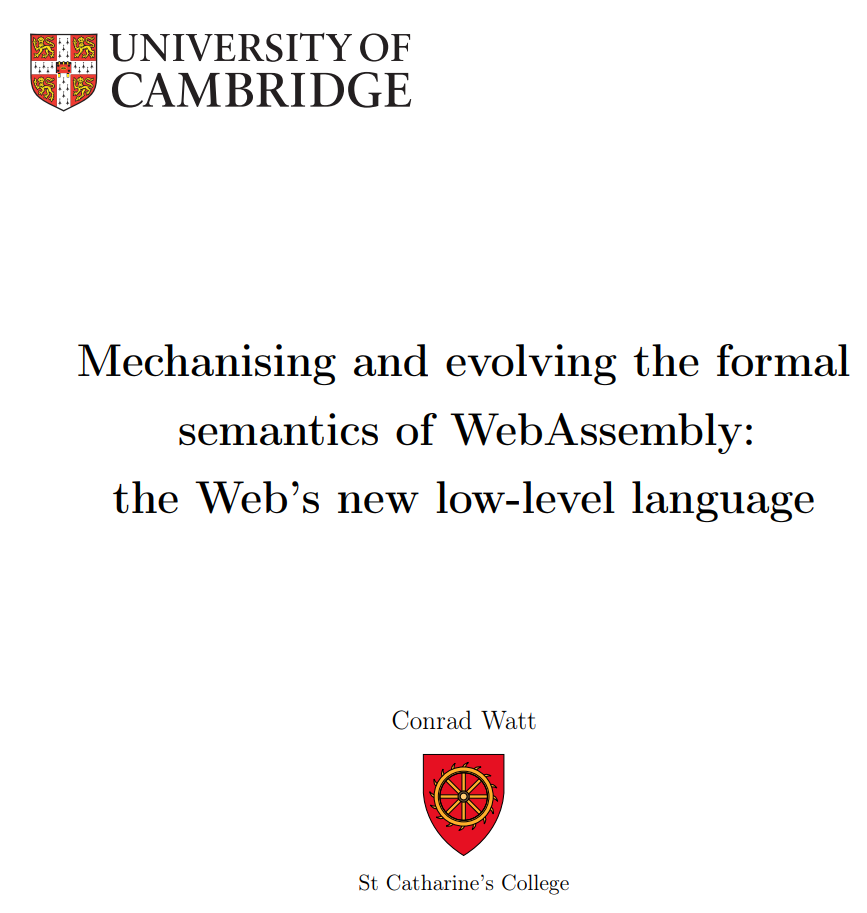 Watt 的博士论文题目为《Mechanising and evolving the formal semantics of WebAssembly: the Web's new low-level language》,创建了 WebAssembly 的机械化语义并定义其并发模型。该模型将成为当前和未来网络工程的基础。