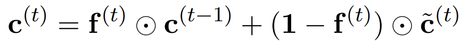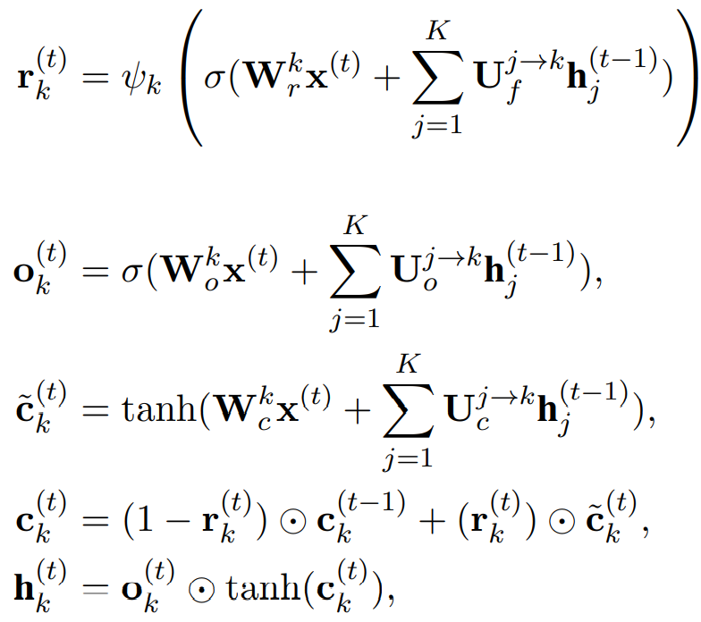 CLSTM旨在通过缓存机制捕捉长距离信息,该机制将记忆分为若干组,不同的遗忘率被视为过滤器,分配给不同的组。不同的组别通过 squashing 遗忘率的尺度来捕捉不同尺度的依赖性。遗忘率高的组是短期记忆,而遗忘率低的组是长期记忆。特别是,把存储单元分为K组{G_1, - -, G_K}。每组包括一个内部存储器c_k、输出门o_k和遗忘率r_k。不同组的遗忘率被压制在不同的范围内。LSTM修改如下: