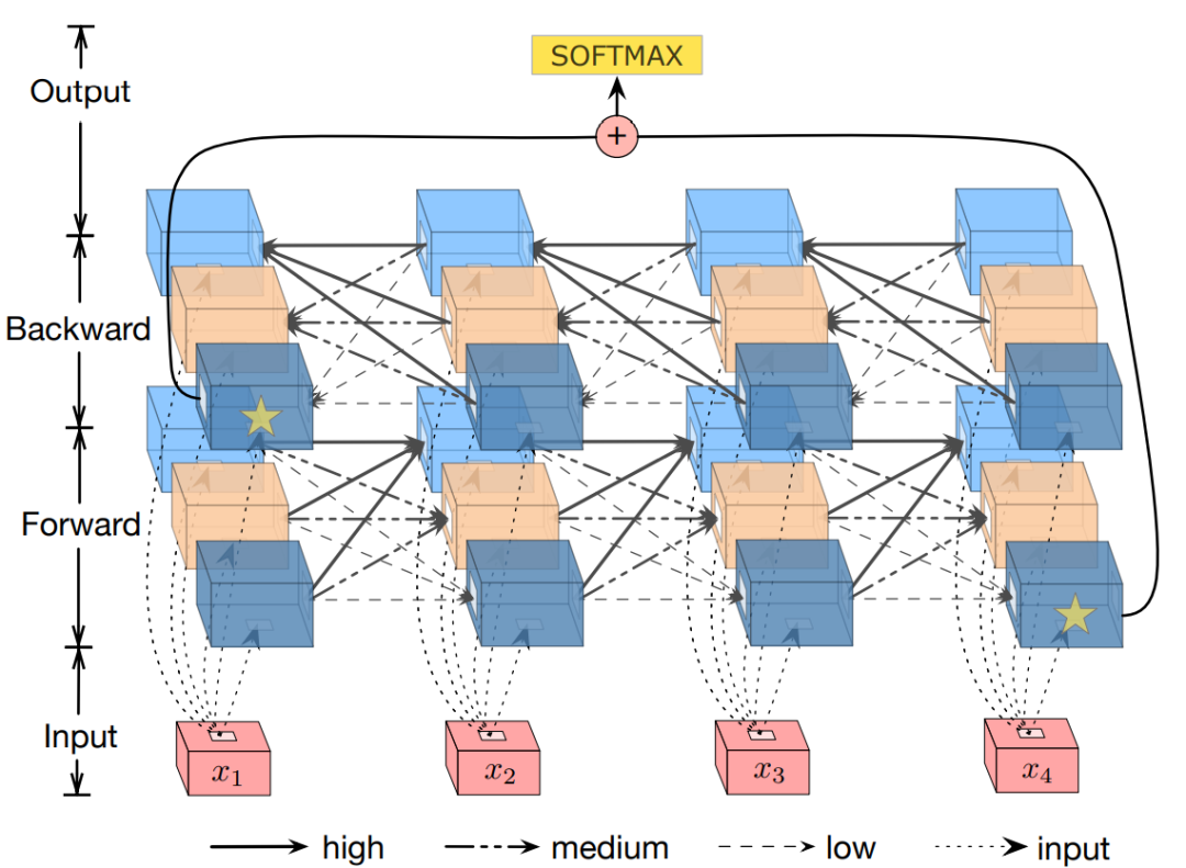 图5 模型架构。不同风格的箭头表示不同的遗忘率。将带有星星的组送入全连接层进行softmax分类。下面是一个B-CLSTM的实例,文本长度等于4,记忆组的数量是3