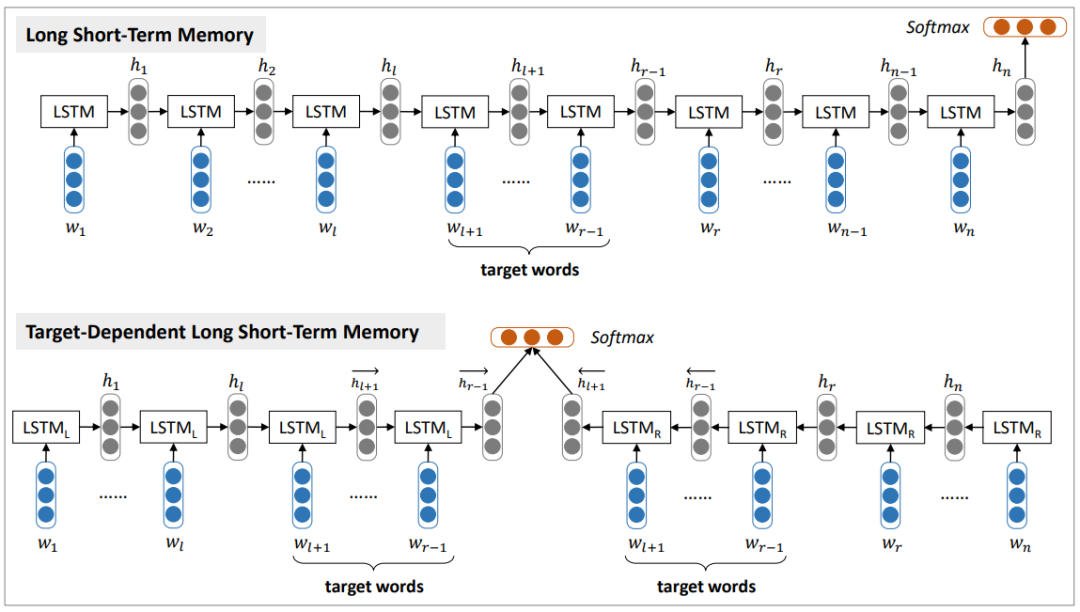 本文首先提出了一种基本的长短期记忆(LSTM)方法,建模一个句子的语义表示,而不考虑被评价的目标词。然后,考虑目标词对LSTM进行扩展,得到目标依赖的长短期记忆模型(TD-LSTM)。TD-LSTM是对目标词与其上下文词的相关度进行建模,并选择上下文的相关部分来推断指向目标词的情感极性。该模型采用标准的反向传播方法进行端到端的训练,其损失函数为监督情感分类的交叉熵误差。最后,对目标连接的TD-LSTM进行了扩展,其中,合并目标与上下文词的语义关联。