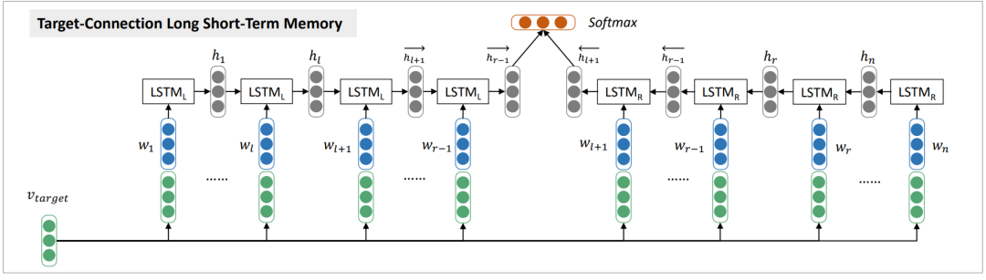TD-LSTM相较于LSTM可以更好的结合上下文的信息,但是人在阅读时除了会考虑到上下文信息,还会考虑到语境,就是目标词与上下文之间的交互关系。由此本文提出了TC-LSTM,TC-LSTM就是简单粗暴的在输入上concat一个目标词的向量表示。该组件在构成句子时明确地利用目标词与上下文词之间的连接。目标字符串t,将目标t表示为{w_l+1, w_l+2…, W_r−1},因为目标可以是可变长度的单词序列,通过对t所包含单词的向量进行平均,得到目标向量v_target。TC-LSTM与TD-LSTM模型的区别是在TC-LSTM中,每个位置的输入是单词嵌入和目标向量v_target的连接。TC-LSTM可以更好地利用目标词和上下文词之间的联系来构建句子的表征。