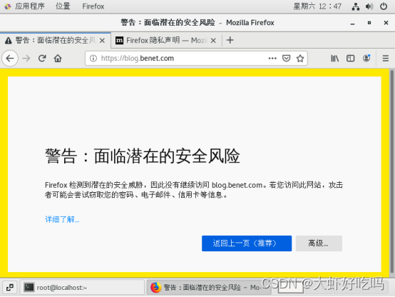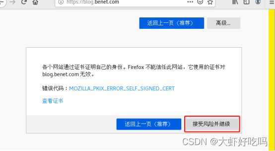 访问浏览器blog.benet.com可以直接转到https,这就是上面重定向的作用。因为本机创建的证书,所以会有风险警告,点击高级。